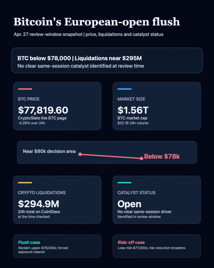 Bitcoin had been pressing the $80,000 decision area, then quickly slipped back under $78,000 before any clear fresh macro, regulatory, exchange, ETF, or issuer headline had emerged.