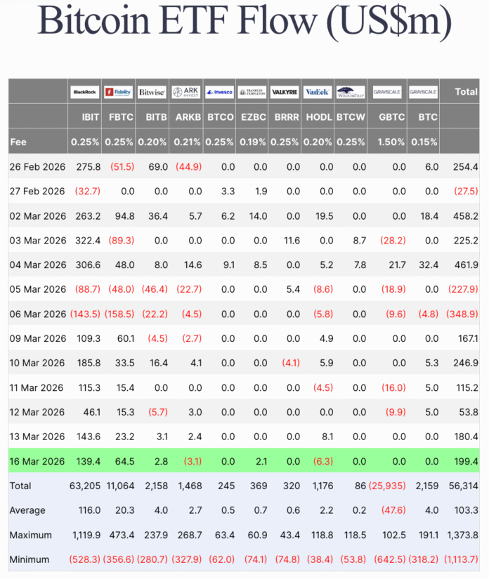 The best proof for this lies in ETFs. Farside data shows that spot Bitcoin ETFs saw $199.4 million in inflows on March 16, marking the sixth consecutive day of inflows after two days of heavy redemptions.