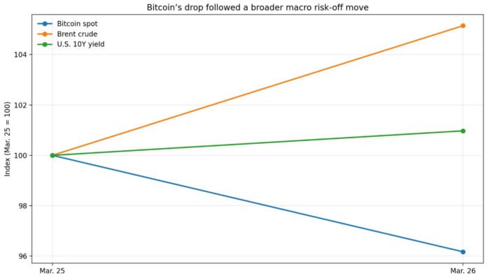 By Mar. 26, that footing gave way: BTC slipped below $69,000 as oil shock, higher yields, and erased rate-cut hopes reasserted themselves.