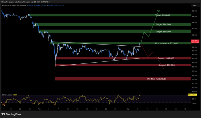 However, the move still needs confirmation. If Bitcoin loses $72,000 and slips back below the breakout zone, the structure quickly turns fragile again. In that case, focus shifts back toward $64,000 support, with $60,000 acting as the next major floor.