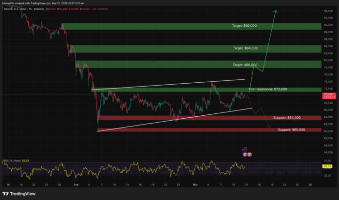 BTC is sitting at $70,471 on the 2h chart, trading inside a rising wedge that has been compressing since early February, with price currently pressing up against the $72,000 first resistance zone.