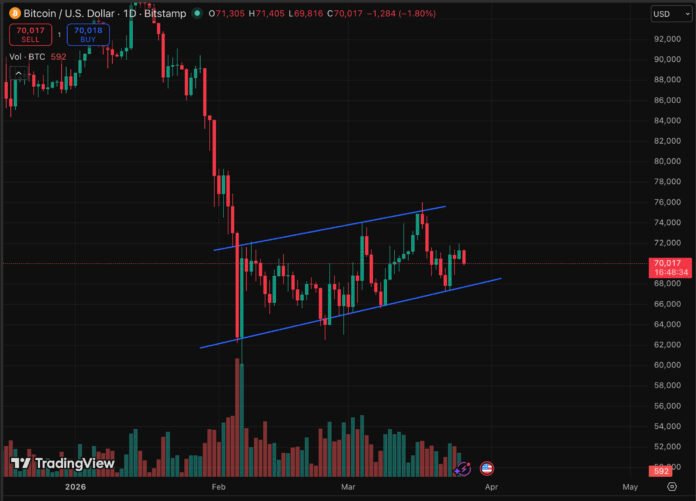 BTC USD is barely holding its ground. Bitcoin price now trades at under $70,000, a 1.6% drop in 24 hours, despite a bullish prediction yesterday. What’s interesting isn’t the number itself, but what the market is refusing to do despite serious headwinds.