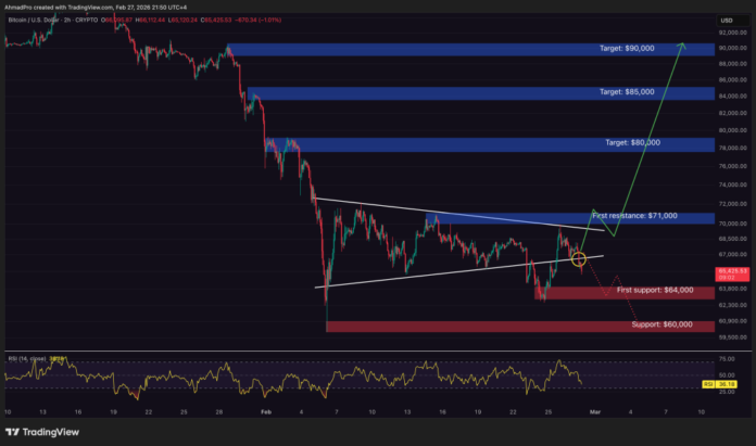 Instead of building pressure toward $71,000, price lost rising support and slid back toward $64,000. That invalidates the immediate breakout setup and gives sellers momentum back.