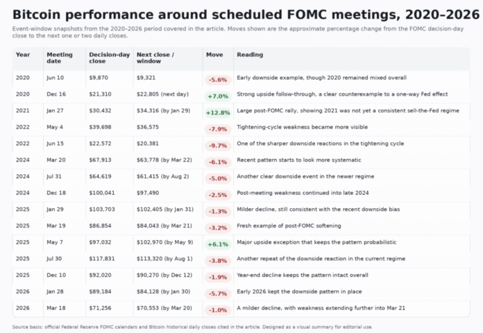 A familiar version of the idea shows up as a quick market stat. Bitcoin often falls after Fed meetings.