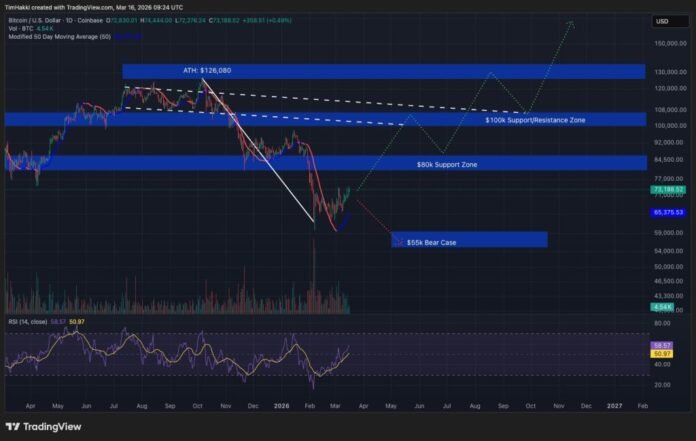 In the bull case, Bitcoin must sustain its position above $73,000 to confirm the breakout. The immediate target is $75,000, a psychological and technical level laden with liquidity. A daily close above $75,000 could open the path toward $80,000, invalidating the bearish structure formed over the last two months.