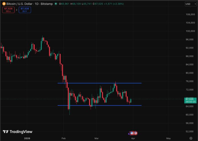 Key levels define the near-term range. Support at $65,000 remains the line bulls cannot afford to lose. Resistance clusters around $73,000. Between those two poles, BTC is consolidating.