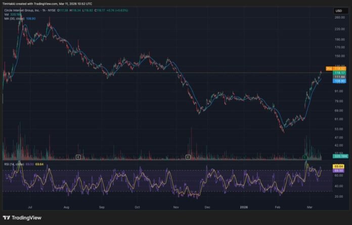 Circle (CRCL) shares just delivered one of Wall Street’s sharpest equity runs of 2026. The stock closed Tuesday at $118.09, up 5.6% on the session, pushing the company’s market cap to roughly $27.81 billion.