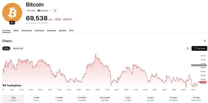 Rep. Jamie Raskin, leading the House effort, called election gambling contracts a direct threat to democratic integrity. This news comes as Bitcoin USD fell -1.8% overnight, losing $70,000 in the process, and is currently trading at $69,500.