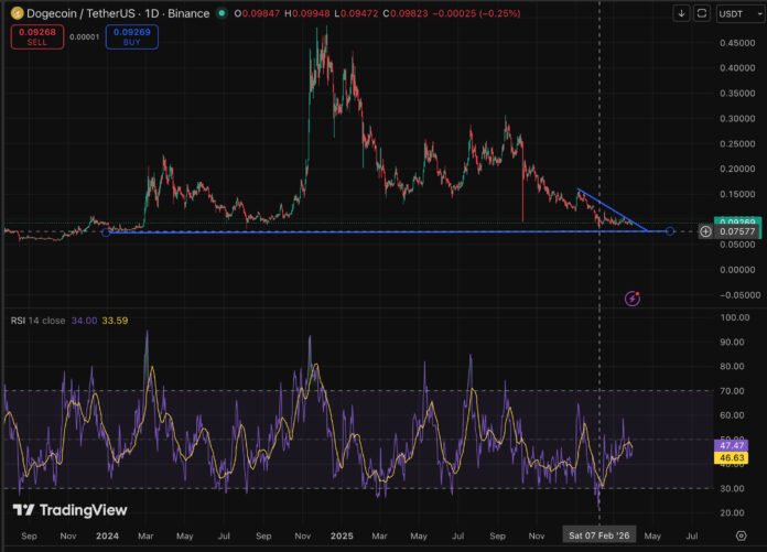 Dogecoin is flashing red. DOGE price is trading at $0.092 rise by 2.5% in 24 hours, following the crypto market recovery with emerging prediction. However, a descending triangle tightens around price action that has already chewed through two key support levels.