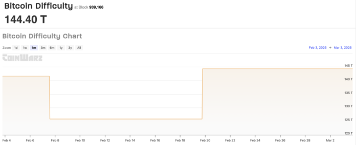 This push comes at a brutal time for miners. Network difficulty is sitting at 144.40 T, meaning 144.40 trillion hashes are needed to mine a single block. It has stayed elevated since mid-February, squeezing margins across the sector.