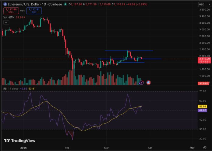 ETH is down by more than 40% of its all-time high, but a confirmed break above the $2,400 zone opens a measured move toward $2,600, with Changelly projecting $2,401 as the March peak and $2,241 by March 28.