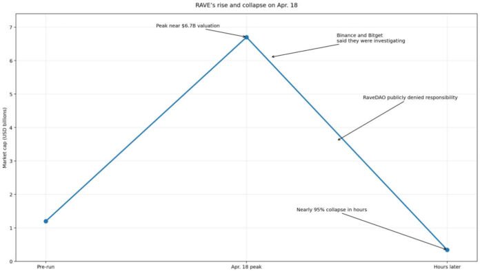 RAVE briefly crossed a $6.7 billion valuation on Apr. 18 before collapsing nearly 95% in hours. The market infrastructure surrounding the token, consisting of thin float, concentrated supply, and a live perpetual market, drove the scale of both the rally and the destruction.