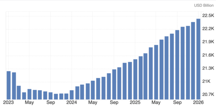 U.S. broad money supply (M2) reached a record $22.442 trillion in January 2026.