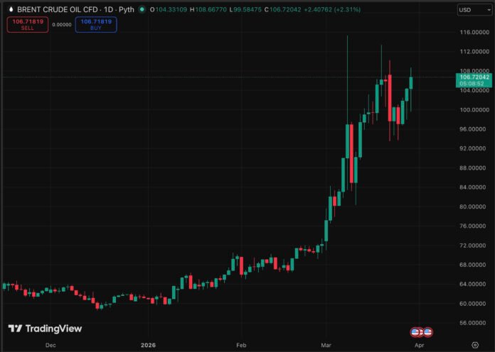 Brent crude oil just posted its biggest monthly price gain on record, 51% since the opening day of the month, and crypto traders are watching both the oil chart and their crypto positions simultaneously before making any prediction.