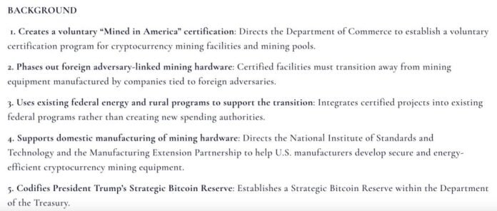 The bill’s core mechanism is a voluntary certification program administered by the Commerce Department. Mining entities that opt in commit to a phased elimination of hardware manufactured by companies tied to foreign adversaries – China and Russia named explicitly – with full phase-out required by the end of the decade.