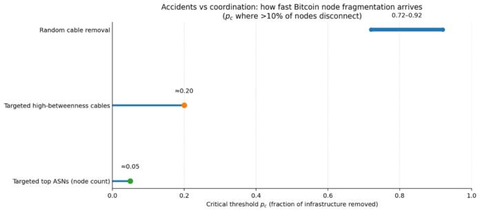 Targeted attacks on top hosting networks reach Bitcoin’s fragmentation threshold at just 5% capacity removal versus 72-92% for random cables.