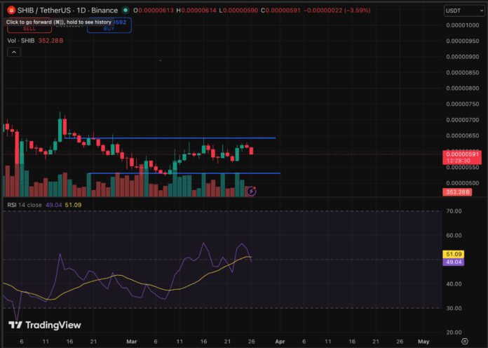 SHIB’s technical picture is genuinely mixed. The RSI is hovering at neutral 49-51, while the Awesome Oscillator remains negative bearish momentum hasn’t flipped yet despite the recent pop.