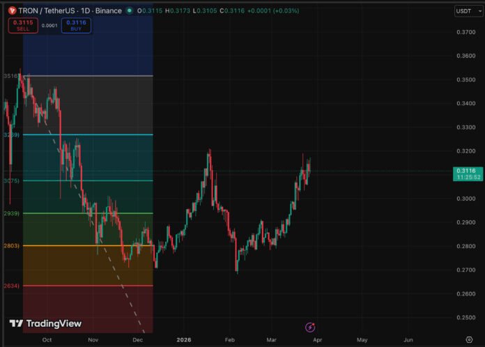 TRX is consolidating in a narrow band after pulling back from its March 25 high near $0.3168. The 30-day return remains positive at +9%, and the yearly gain sits at +33%, but short-term momentum is stalling.