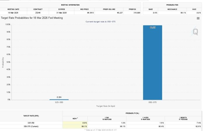 - Futures markets price a near-zero chance of a cut at the March 17 FOMC meeting.