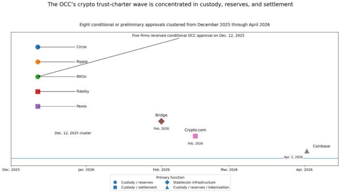 The OCC conditionally approved Circle, Ripple, BitGo, Fidelity, and Paxos on Dec. 12, 2025. Bridge followed in February, Crypto.com in February, and Coinbase in April.