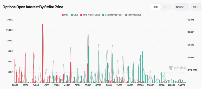 The strike data backs up the same point. CoinGlass data shows dense exposure between $70,000 and $75,000, so these two strikes are doing most of the work.