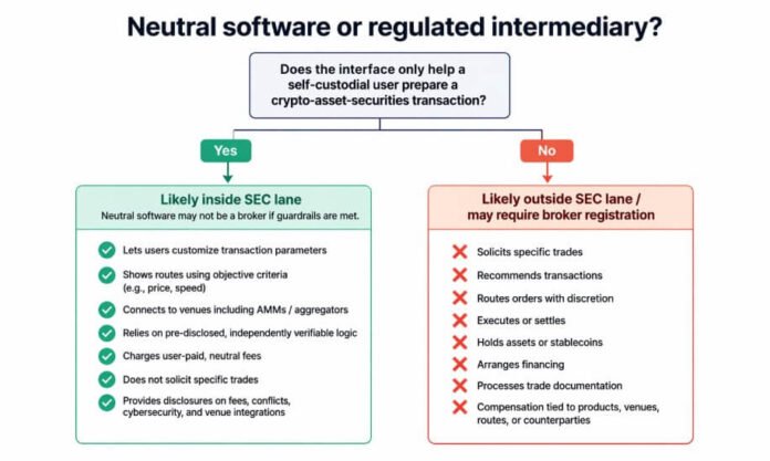 A flowchart outlines the SEC’s two-path test for crypto interfaces, listing seven qualifying conditions for neutral software and eight activities that trigger broker registration.