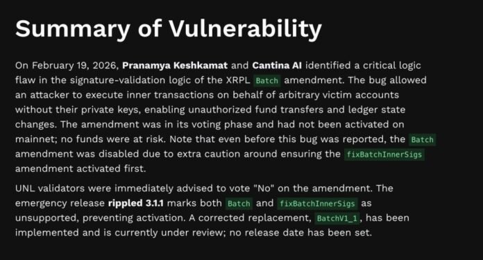 Researchers found a flaw in the proposed “Batch” amendment (XLS-56) that, under certain conditions, could have allowed attackers to manipulate grouped transactions.